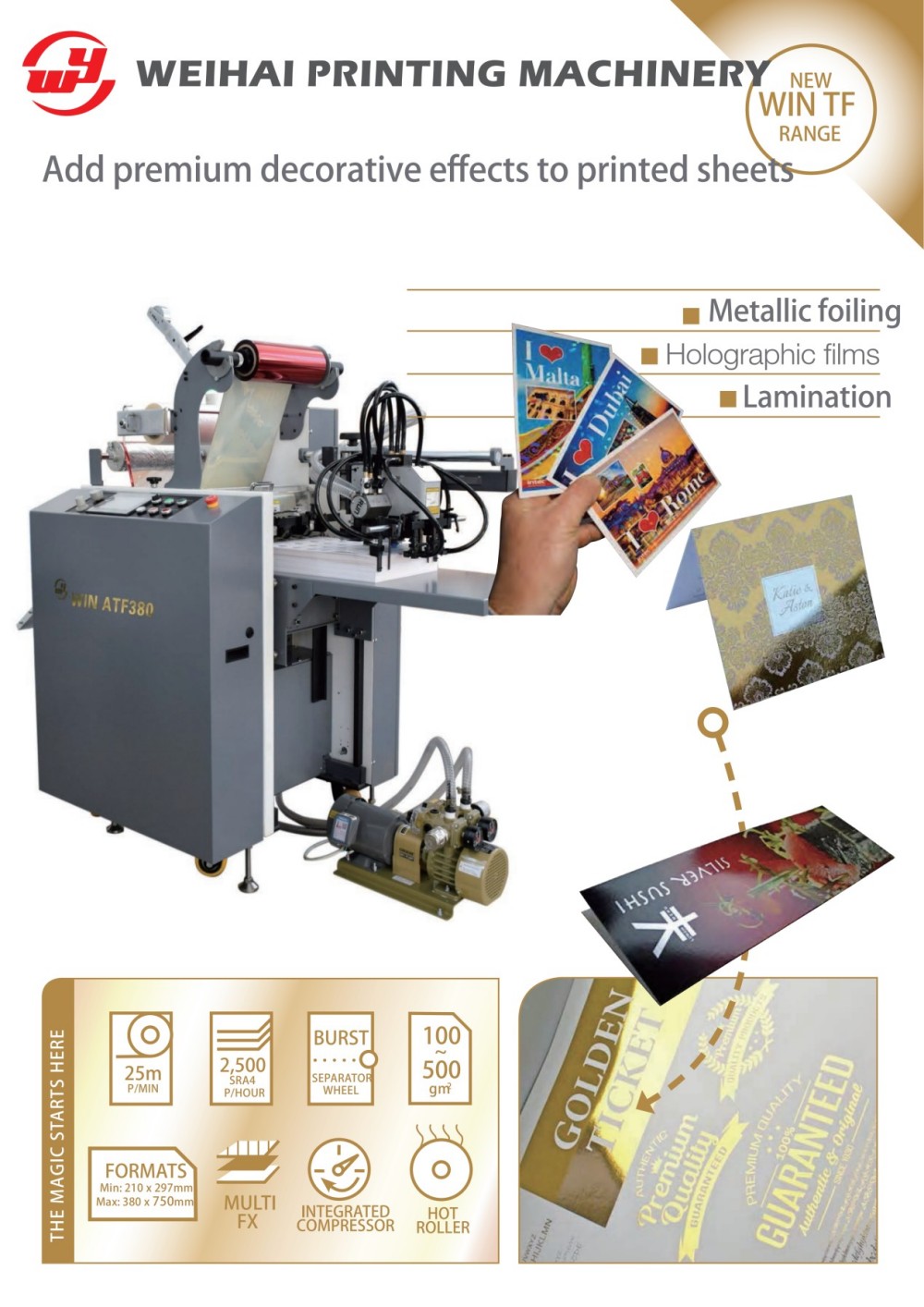 వీహై ప్రింటింగ్ మెషినరీ కో., లిమిటెడ్ ద్వారా ఉత్పత్తి చేయబడిన 380mm షీట్-ఫెడ్ లామినేటింగ్ మరియు ఫోయిలింగ్ ప్రెస్ పూర్తిగా ఆటోమేటిక్ లామినేటింగ్ మరియు హాట్ స్టాంపింగ్ ఫంక్షన్‌లను కలిగి ఉంది. ఇది ప్రధానంగా డిజిటల్ ప్రింటెడ్ ఉత్పత్తుల కోసం ఉపయోగించబడుతుంది, అయితే స్వయంచాలకంగా లామినేట్ మరియు హాట్ స్టాంప్ ఆఫ్‌సెట్ ప్రింటెడ్ మెటీరియల్‌లకు కూడా ఉపయోగించబడుతుంది. ఇది ఒక అద్భుతమైన ఆటోమేటిక్ ప్లేట్ రహిత లామినేటింగ్ మరియు ఫాయిలింగ్ ప్రెస్ మెషిన్.