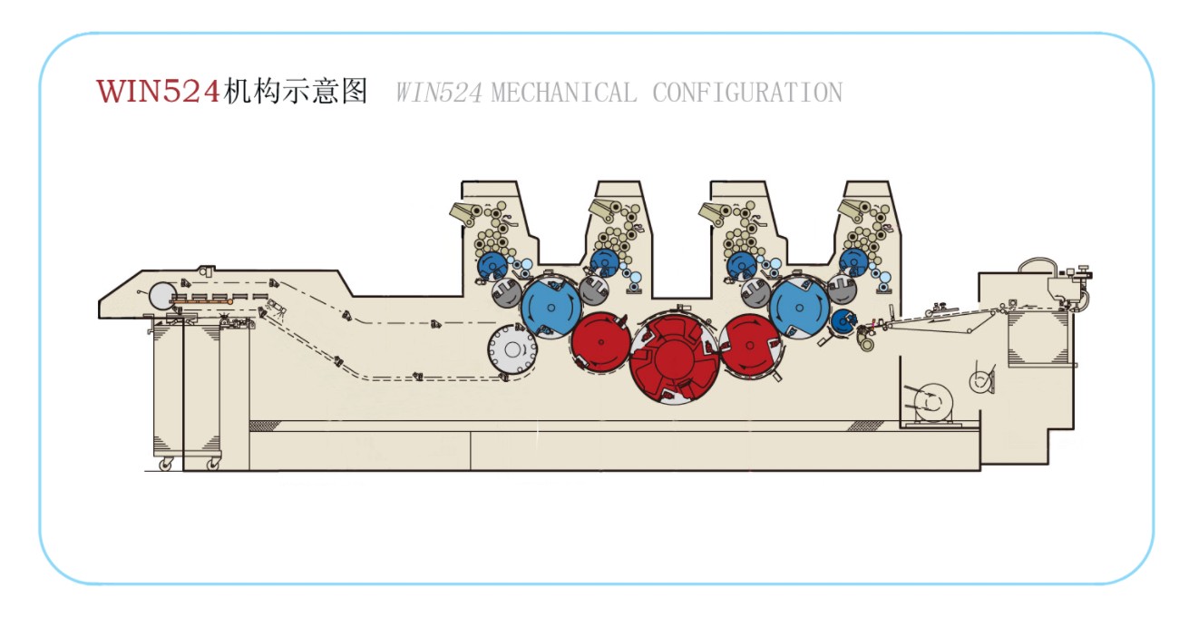 9)డబుల్-వ్యాసం ఇంప్రెషన్ సిలిండర్లు మరియు ట్రిపుల్-వ్యాసం బదిలీ సిలిండర్ల ఉపయోగం పేపర్ బదిలీల సంఖ్యను తగ్గిస్తుంది మరియు అందువల్ల పేపర్ రిజిస్ట్రేషన్ యొక్క ఖచ్చితత్వాన్ని మెరుగుపరుస్తుంది.
