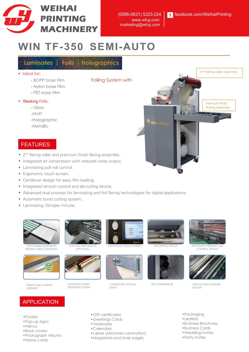 మాన్యువల్-ఫీడ్ లామినేటింగ్ మరియు ఫోయిలింగ్ మెషిన్ అనేది మాన్యువల్ పేపర్-ఫీడింగ్ లామినేటింగ్ మరియు మెటల్ ఫాయిలింగ్ పరికరాలు, ఇది వీహై ప్రింటింగ్ మెషినరీ కో., లిమిటెడ్ రూపొందించింది మరియు తయారు చేయబడింది. కాంపాక్ట్ డిజైన్‌తో, ఇది లామినేటింగ్ మరియు మెటల్ ఫాయిలింగ్ ఫంక్షన్‌లను ఏకీకృతం చేస్తూ వర్క్‌షాప్ స్థలాన్ని ఆదా చేస్తుంది, ఇది ఎంటర్‌ప్రైజెస్ డెకరేటివ్ ప్రాసెసింగ్‌కు తగినది. ఇది సాధారణ ప్రింటెడ్ మెటీరియల్‌లను హై-గ్రేడ్ సున్నితమైన పూర్తి ఉత్పత్తులుగా మార్చగలదు మరియు ఇది డిజిటల్ ఆన్-డిమాండ్ అప్లికేషన్‌లు మరియు సాంప్రదాయ లితోగ్రాఫిక్ ఆఫ్‌సెట్ ప్రింట్‌లు రెండింటికీ పూర్తిగా అనుకూలంగా ఉంటుంది. సరైన ప్రాసెసింగ్ ఫలితాలను నిర్ధారించడానికి, యంత్రం ఒక ఎలక్ట్రానిక్ నియంత్రణ పరికరంతో అమర్చబడి ఉంటుంది, ఇది రన్నింగ్ స్పీడ్, పేపర్ మందం మరియు డిజైన్ నమూనాల వంటి కీలక వేరియబుల్స్ ప్రకారం ఆపరేషన్ సమయంలో రోలర్ ఒత్తిడి మరియు తాపన ఉష్ణోగ్రతను సర్దుబాటు చేస్తుంది. అధిక-పనితీరు గల మాన్యువల్-ఫీడ్ హాట్ స్టాంపింగ్ మరియు లామినేటింగ్ ఎక్విప్‌మెంట్‌గా, కస్టమర్‌ల ఉత్పత్తుల అదనపు విలువను గణనీయంగా పెంచడానికి ఇది ధృవీకరించబడింది. విభిన్న అలంకార అవసరాలను తీర్చడానికి వినియోగదారులు విస్తృత శ్రేణి లామినేటింగ్ ఫిల్మ్‌లు మరియు మెటల్ ఫాయిల్‌ల నుండి ఎంచుకోవచ్చు. అంతేకాకుండా, బ్యానర్‌లు మరియు అదనపు-పొడవైన ప్రింటెడ్ మెటీరియల్‌లను ఉంచడానికి ఇది పొడిగించిన పేపర్ ఫీడింగ్ టేబుల్‌తో అమర్చబడింది.