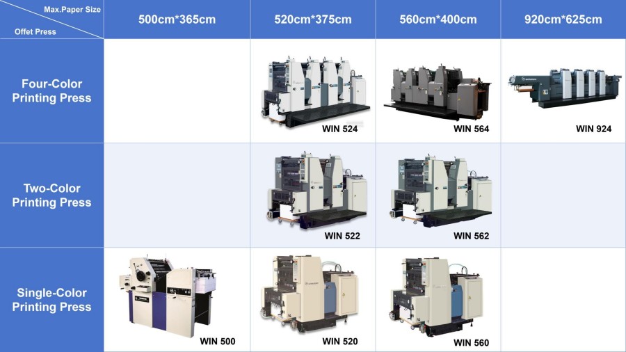 విన్ ఆఫ్సెట్ ప్రెస్ హై-స్పీడ్ మరియు స్టాండర్డ్-స్పీడ్ వెర్షన్ల వంటి విభిన్న ఉత్పత్తి సామర్థ్యాలతో మోడల్లను అందిస్తుంది, ప్రింటింగ్ వేగం గంటకు 3,000 నుండి 13,000 షీట్లు మరియు ప్రత్యేకమైన ధర ప్రవణతతో ఉంటుంది. కస్టమర్లు వారి ఆర్డర్ వాల్యూమ్లు మరియు ఉత్పత్తి సామర్థ్య అవసరాలకు అనుగుణంగా అనుకూలమైన WIN సింగిల్-కలర్ ప్రింటింగ్ ప్రెస్, టూ-కలర్ ప్రింటింగ్ ప్రెస్, ఫోర్-కలర్ ప్రింటింగ్ ప్రెస్లను సులభంగా ఎంచుకోవచ్చు.